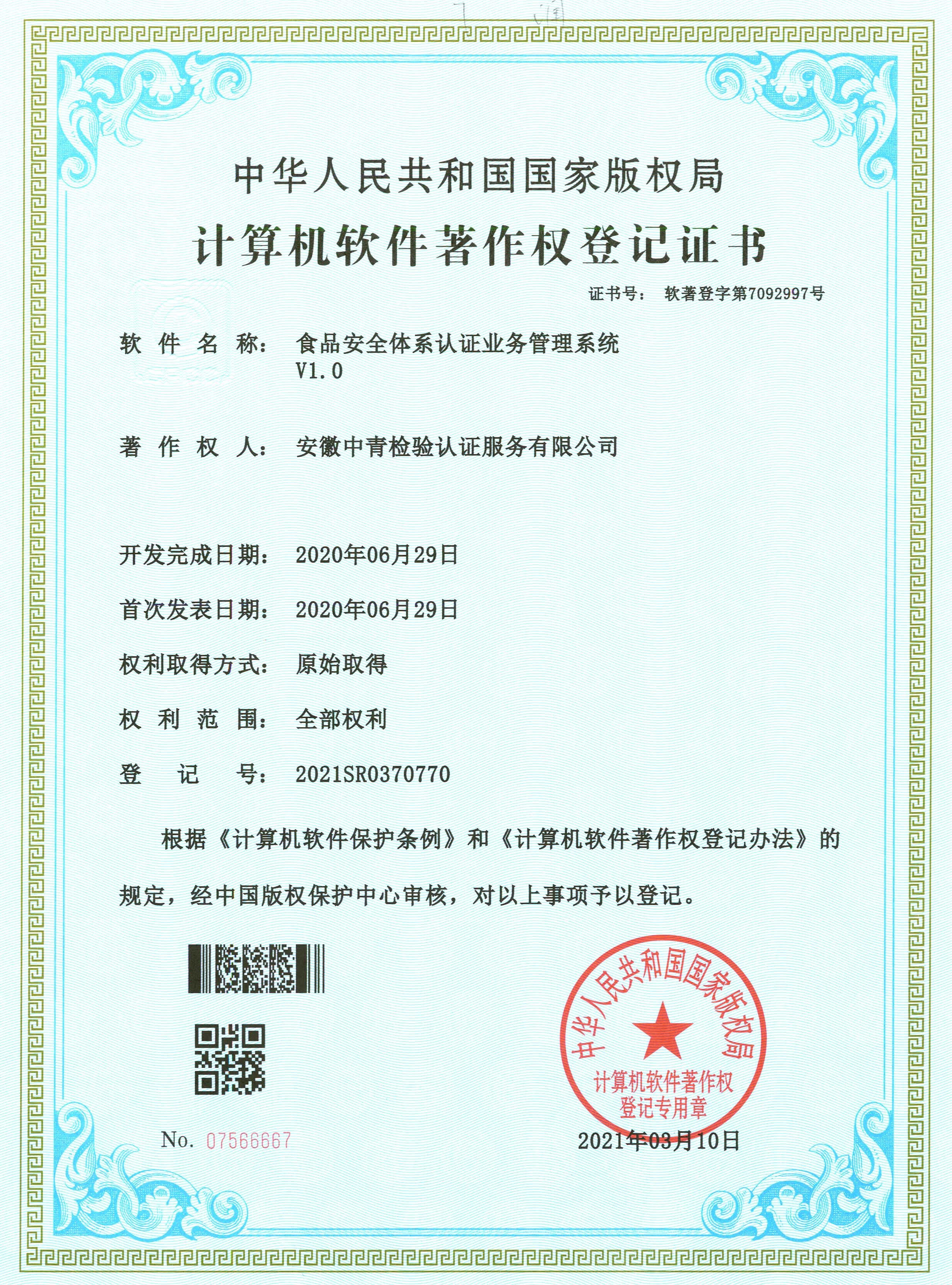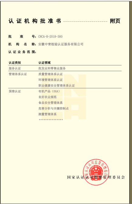 安徽中青檢驗(yàn)認(rèn)證服務(wù)有限公司成立于2017年6月6日,2018年1月3日通過國(guó)家認(rèn)證認(rèn)可監(jiān)督管理委員會(huì)批準(zhǔn),現(xiàn)認(rèn)證領(lǐng)域:質(zhì)量管理體系、環(huán)境管理體系、職業(yè)健康安全管理體系、食品安全管理體系、HACCP管理體系、有機(jī)產(chǎn)品認(rèn)證、良好農(nóng)業(yè)規(guī)范、服務(wù)體系、醫(yī)療器械質(zhì)量管理體系、企業(yè)誠(chéng)信管理體系、食品工業(yè)企業(yè)誠(chéng)信管理體系、食安安徽品牌等類別認(rèn)證。